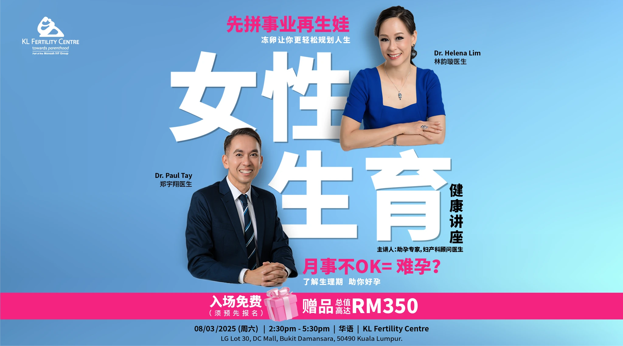 此外,另一项困扰女性的就是生理期的各种问题,比如月经疼痛、经期失调,到底会不会导致难孕呢?这场座谈的两位嘉宾 Dr Helena Lim 及 Dr Paul Tay 都是资深的妇产及助孕专科,他们将为大家详细解说,同时也会有Q&A session让大家发问。座谈会是免费的,还有RM350 Freebies好康带回家,想出席的记得提前报名。​